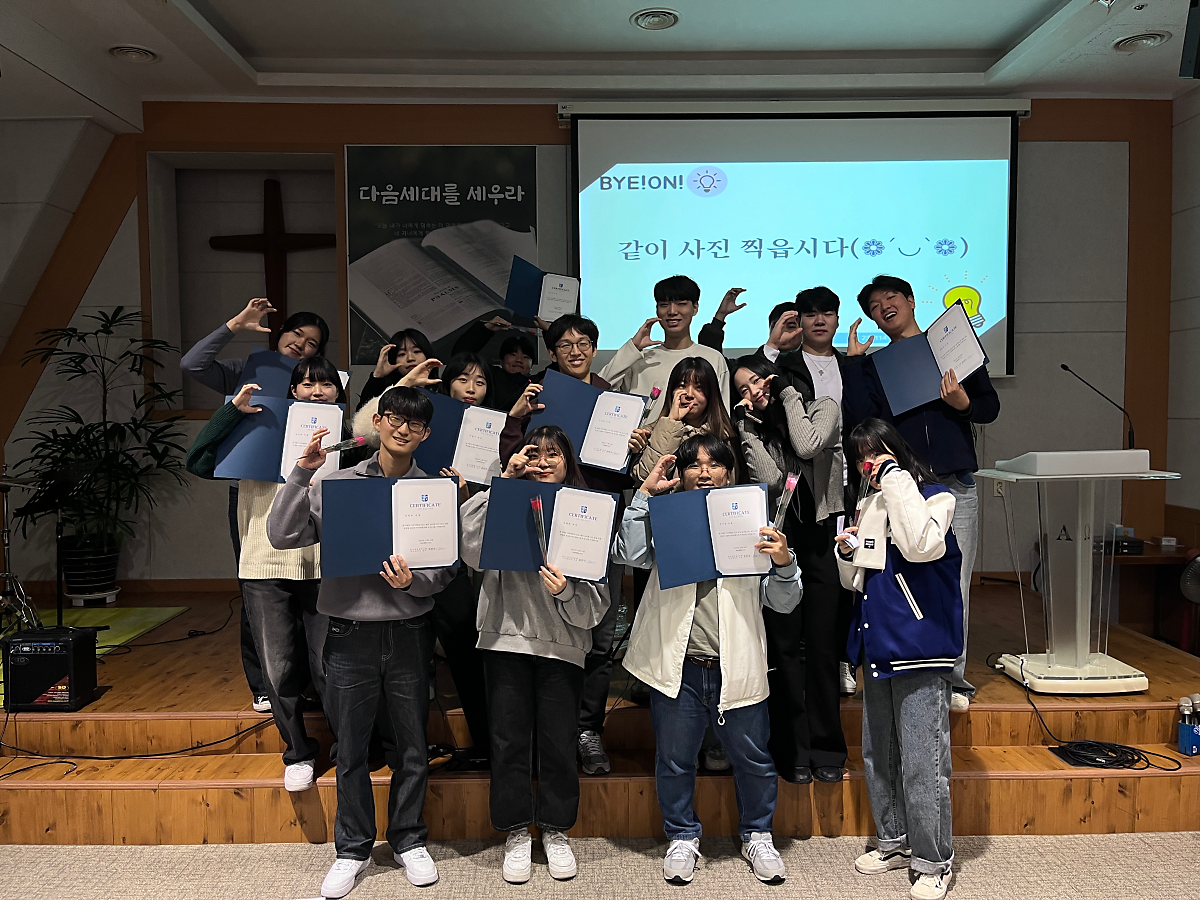 총 23명의 지체들이 참여하여 12명이 수료했습니다. 한창 과제와 팀플이 많은 시기 임에도 불구하고 2주 동안 시간을 내서 강의를 듣고 추운 날씨 속에서 캠퍼스에 나가 사영리 전도까지 충실하게 해낸 지체들이 정말 귀했습니다.